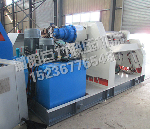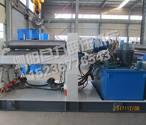 該四輥卷板機與對稱三輥卷板機比較,它可以不借助其它設備模具,直接予彎板材端部,而且剩余直邊較小;它可以不使板材調頭,而卷成工件。