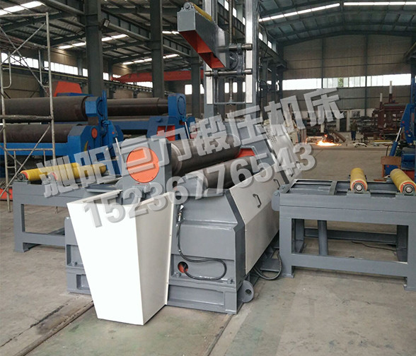 該四輥卷板機與對稱三輥卷板機比較,它可以不借助其它設備模具,直接予彎板材端部,而且剩余直邊較小;它可以不使板材調頭,而卷成工件。